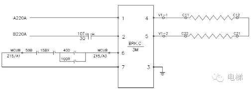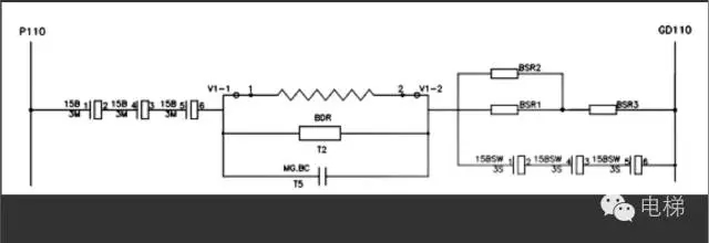 2.當(dāng)抱閘控制方式為接觸器驅(qū)動(dòng)時(shí),使用日立HSGL型主機(jī)或廣日主機(jī),使用抱閘接觸器對(duì)抱閘供電控制,控制柜內(nèi)有BDR及BSR制動(dòng)電阻。其抱閘控制回路如下圖所示: