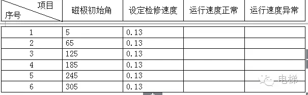 ⑷ 按下表的方式以每次對(duì)F7.09(磁極初始角)加60的方式進(jìn)行記錄,最終保證檢修時(shí)速度等于設(shè)置的檢修速度;